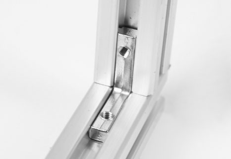 用于兩型材的直角連接,安裝時(shí)將其兩端分別插入型材槽坑內(nèi),將緊固螺絲鎖緊。根據(jù)型材的槽寬及連接方式請(qǐng)選用不同的角槽連接件。