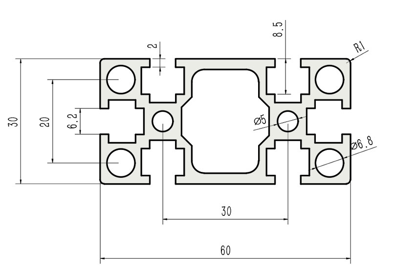 適用于應(yīng)力及強(qiáng)度較大的框架組合結(jié)構(gòu),它的外型采用直角過渡,表面經(jīng)過陽極氧化處理,高雅美觀并抗腐蝕,它通常采用M6X20高強(qiáng)度專用螺栓的內(nèi)部連接方式,堅固而又可靠,是工業(yè)框架應(yīng)用較為廣泛的型材之一。